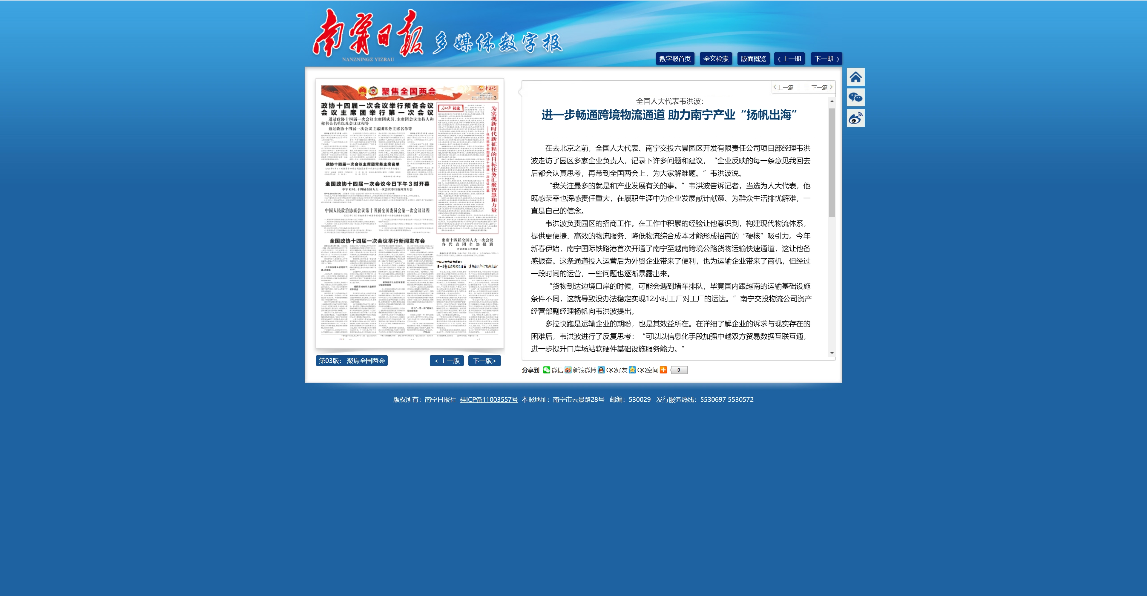 全國人大代表韋洪波:進(jìn)一步暢通跨境物流通道 助力南寧產(chǎn)業(yè)“揚(yáng)帆出海”