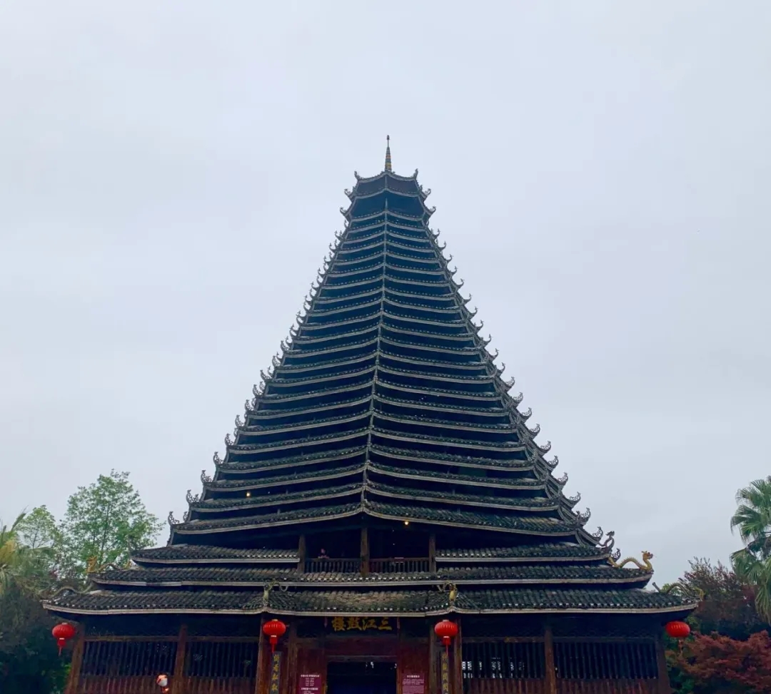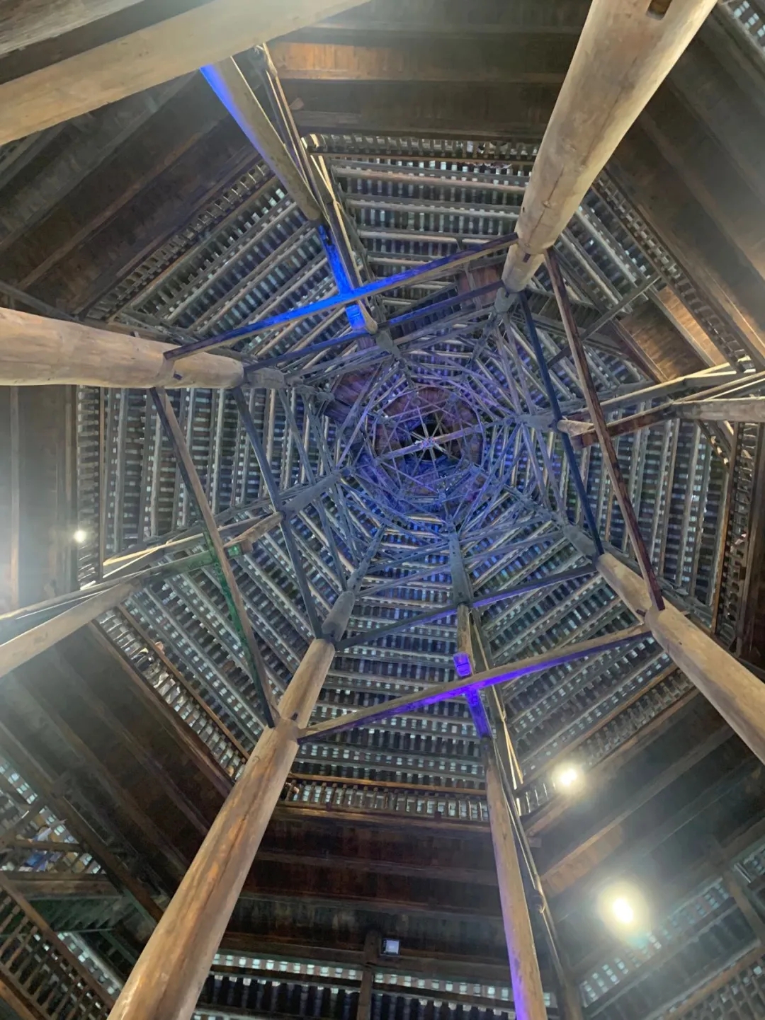 仰觀閃閃魔幻,感受侗族建設(shè)的精美藝術(shù),把疏密、粗細(xì)、剛?cè)岬韧昝赖亟Y(jié)成一個(gè)整體,展現(xiàn)侗族工匠的精美建筑技藝。不用一顆鐵釘,結(jié)構(gòu)十分嚴(yán)謹(jǐn)穩(wěn)固。樓內(nèi)四根杉木大柱直徑都超過(guò)70厘米,樹(shù)齡均在百年以上,這在鼓樓建筑史上是唯一的。